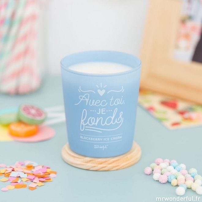 Laissez-vous emporter par les arômes des délicieuses bougies parfumées de la marque espagnole Mr. Wonderful ! Ici, la bougie « Avec toi, je fonds » avec son doux parfum de glace à la mûre pour une atmosphère douce et gourmande à la maison. Les bougies sont fabriquées avec de la cire végétale et beaucoup d’amour. Le petit plus ? Une fois la bougie terminée, vous pouvez nettoyer le contenant et l’utiliser comme boîte à trésors, pot à crayon ou cache-pot en y mettant une jolie plante. Un objet déco validé !