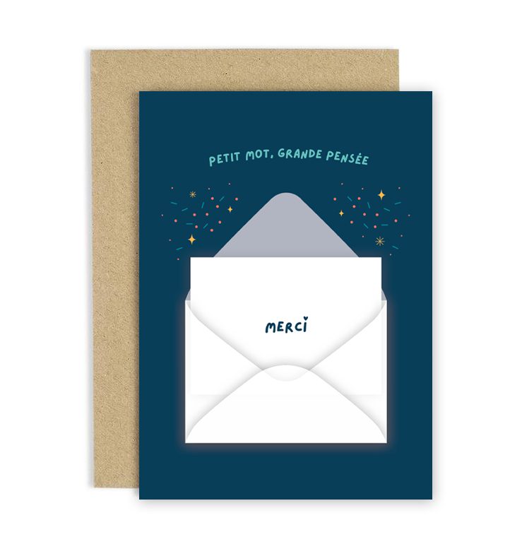 Carte de voeux simple pour écrire un message à une personne chère à votre cœur. Rien de mieux pour compléter un cadeau qu’un petit mot ! Son originalité ? Il y a une vraie mini enveloppe tout en transparence avec sa mini carte « Merci » assortie dessus ! Vous pouvez donc écrire un mot au dos de la mini carte Merci, ainsi qu’au dos de la carte principale. Vous souhaitez une jolie enveloppe pour accompagner cette carte ? C’est par ici !