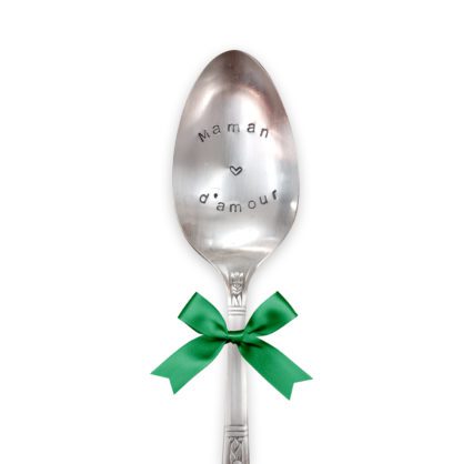 Petite cuillère « Maman d’amour ». Maya, la créatrice de The Loving Spoon, sélectionne et chine les plus belles pièces d’argenterie vintage un peu partout dans le monde. Elle les restaure et les grave à la main une à une avec de jolis messages dans son atelier à Zürich (Suisse). Chaque cuillère est unique ! Une chouette idée de cadeau à faire à un proche (ou à garder pour soi). Lavage à la main conseillé et si votre pièce terni avec le temps (ce qui est normal), nettoyez-la avec un peu de bicarbonate de soude et un peu d’eau !