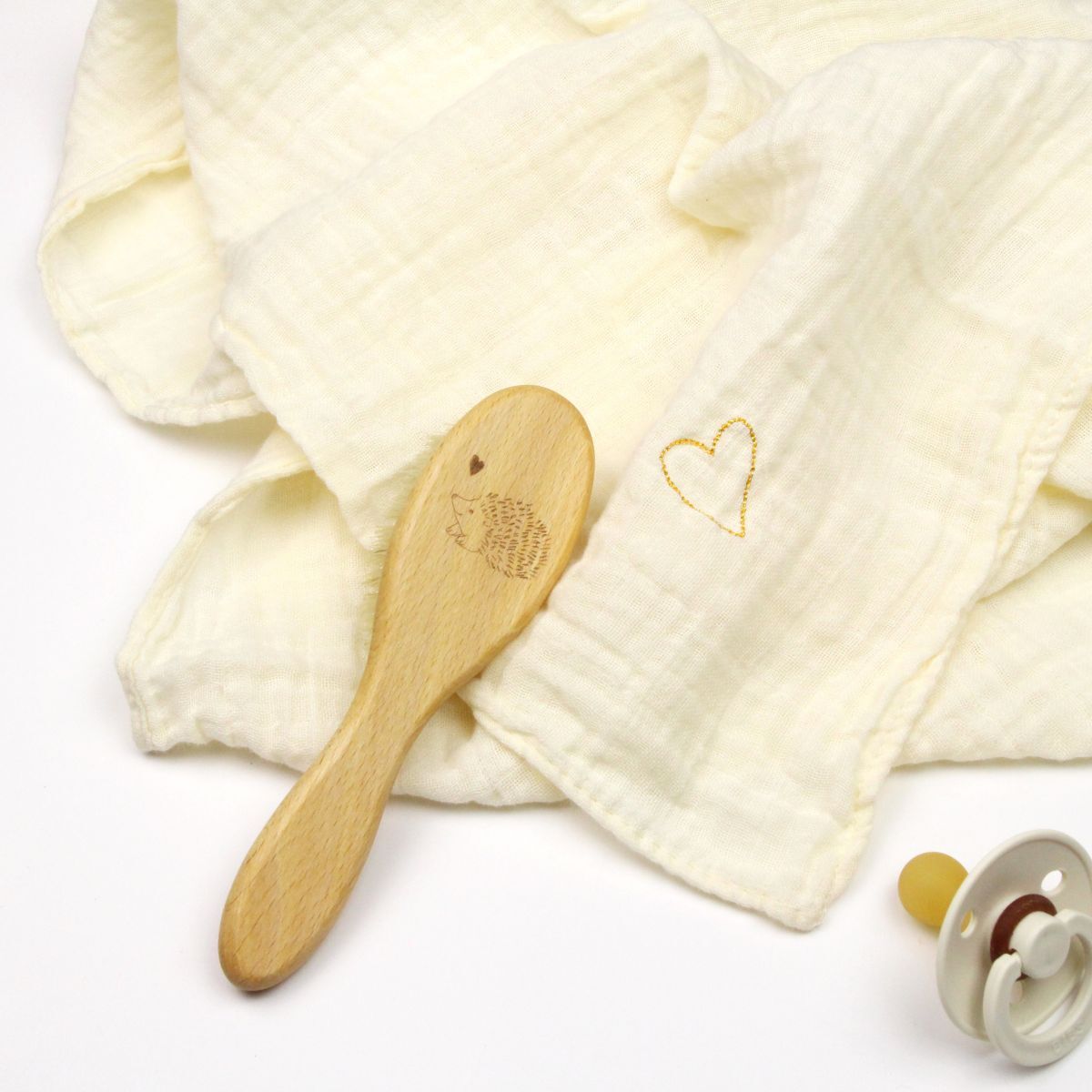 Le joli petit détail : le coeur brodé dans l’un des angles au fil doré (lurex). Composition 100% gaze de coton, tissu aux normes Oeko-tex, lavage à 40° maximum recommandé. Plus on le lave, plus il devient doux ! Teint et brodé au Portugal.