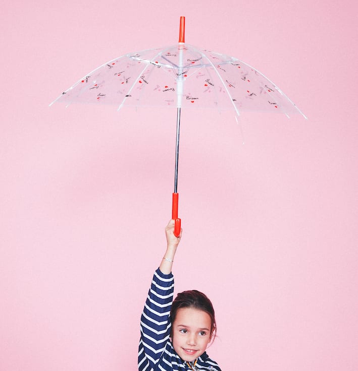 Pour que votre bout de chou se balade avec des bisous partout au-dessus de lui lorsque les jours sont tout gris, ce parapluie transparent est un indispensable pour avoir le smile ! Un accessoire du quotidien qui rend instantanément happy, c’est l’effet parapluie de la joyeuse marque Mathilde Cabanas. Grâce à son joli motif Bisou, votre enfant affrontera désormais la pluie avec le plus grand des sourires. Existe aussi en format pour adulte ici !